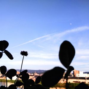 午後6時半の大阪の東の空 白い月と飛行機雲 プリンセスクローバーのシルエット