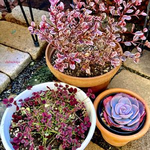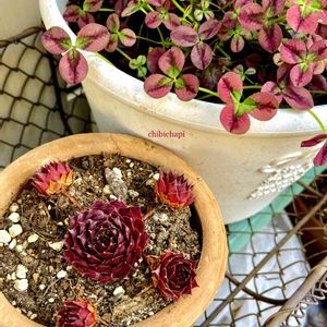 プリンセスクローバー イザベラ 赤い葉っぱが綺麗です✨✨ 寄せ植えの隅っこに脇役扱いで入れたけどどんどん広がって主張しています😊💕 隣は見切り品のガーデンシクラメン 後ろは去年水挿しして根付いた千日小坊 こちらも早くもりもりにならないかなぁ😆