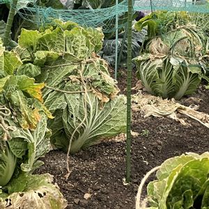 午前中に畑に 白菜畑🥬 昨日はふた株運びましたよ 鳥避けの網をかけてます🐦⬛ 2️⃣3️⃣散歩道の蝋梅の花🌼🌼 葉っぱも一緒だと花が目立たないですね🌼 4️⃣5️⃣白い椿が咲いてる公園 白い花が目立ちます🤍💚