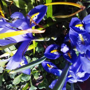 ラナンキュラスラックスピュタロスの地植え花壇から、葉っぱの下敷きになりながら頑張って出てきた ミニアイリス💕 この子達も裏庭のシェードガーデンに移そうかな〜