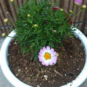 枯れっ枯れのセール品だったモリンバ ピンク。 ミニピンクなのか、サッシーピンクなのか……咲いたら分かると思ったら咲いても分からない…… でも、やっとお花が見れた✨ マーガレットはジャイアントピンクが最近まで満開だったけど あれお花がデカくて💦笑 こっちはお花が小さくて可愛い✨