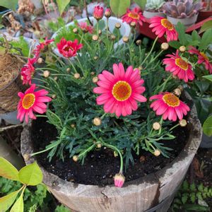 冬を越して一回り大きくなったマーガレットモリンバ ミニピンク🌸 春の光に輝いています✨