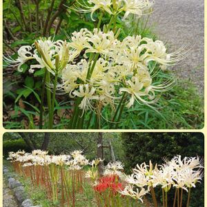 ヒガンバナ 台風が来る前に紅白のヒガンバナを見てきました。 赤いヒガンバナはまだ半分くらいしか咲いていません。 ↓の写真で緑の茎が赤いヒガンバナなんです。 ↑のヒガンバナは茎が緑色、花の色も下のお花より白いです。