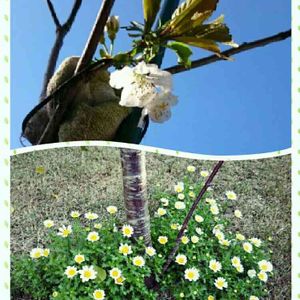 さくらんぼの花が咲きました🌼 まだこれだけですが可愛い✴ 花の後ろはパパさんがはさんでる軍手💦 さくらんぼの木の下にはノースポール🌼