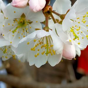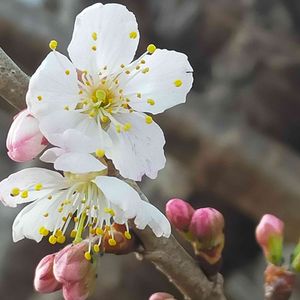 さくらんぼの花が開花してました🎵 初めてのさくらんぼの花💠 ほかの蕾も少しほころび始めていました😊 我が家には3種類のさくらんぼを鉢植えしてます。 はたして実がつくのかなぁ🙄🍒