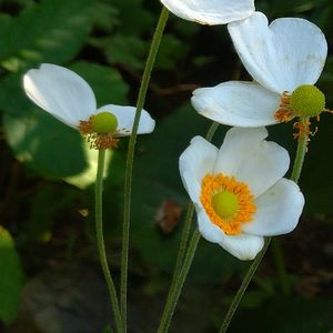 朝の光をあびて、シュウメイギクが三輪咲いています。