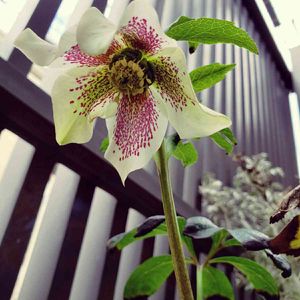 クリスマスローズ 我が家ののんびり屋さん❗ やっと咲きました~💦 フェンスギリギリの下向きに咲いてるから写真が撮りにくい~😅 色白そばかすが可愛いお嬢様です👧