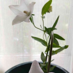 倒れて元気がなかったキキョウを、挿しておきましたら、わりに早く花が咲きました。 下のお花は、本当は、もうちょっと淡紫。「明智光秀」と、名前が付いていました。🤭