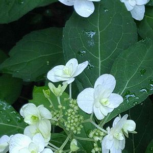 華やかに咲き揃った山アジサイ。 雨の日も、周りは明るく輝いています。