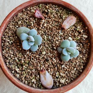 昨年夏にお迎えしてすぐ★になってしまった丸葉ピンクラウイの葉挿しがだいぶラウイらしくなりました✨🥰 2022/12/27と今年2023/1/28にそれぞれ投稿しています☺️ ただ、残念なことに、プツリと小さな芽が見えていた葉(左上↖)は日差しが強すぎて萎れて枯れてしまいました…😭根も出ていたのになぁ…🥲 考えてみればそもそも、芽の成長がここまで違う葉挿しを同じ鉢(と環境)で管理していたことが間違いでした…反省…😭