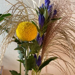 お月見* お花を買ってきたけど まさかの家のそばにいっぱい群生してた💦 #ススキ #ピンポンマム #りんどう