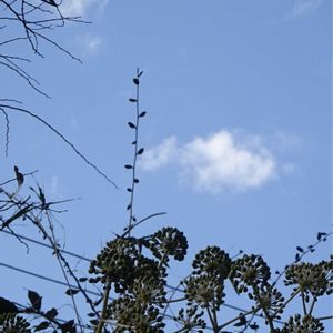 おはようございます😃 今日のお花 ユッカ キミガヨラン(多分) リュウゼツラン科 イトラン属(ユッカ属)常緑低木 別名 ユッカ ユッカラン 散歩道で 左右違う株です。 左 11月24日 左 R7 1月11日 メモ キミガヨランの開花時期は、5~6月と10~11月の年2回で、夕方から夜にかけて開花する。葉の中心部から伸びる太い花茎は1~2mにもなり、そこに大きな卵形の花が数十輪、円錐状に並んで下向きに咲く。 ・花の直径は3~5センチ。6枚ある白い花弁の外側には紫色を帯びた模様が入る。原産地ではユッカガという独特の蛾によって花粉が媒介、受粉されるが、日本では開花しても結実しないため、挿し木や株分けで増やす。 植木ペディアより
