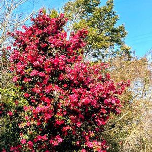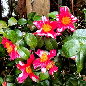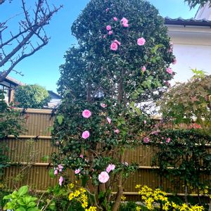 サザンカ(山茶花) 通り道の駐車場側のお宅に 午後の散歩道