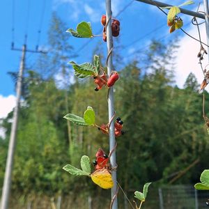 久しぶりに通る散歩道脇のフェンスに色んな実が見られました ヤブガラシの実、珍しくないですか⁉️ 3倍体では5枚の小葉を持つ複葉ですが 2倍体では3枚の小葉です