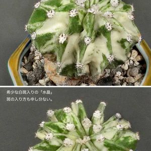 これは短毛丸の白斑入り「水晶」です。 ずっと昔....、サボテン文献で「短毛丸には黄斑の「世界の図」と白斑の「水晶」の斑入りがある」と知りました。短毛丸・斑入りは殆どは黄斑の「世界の図」が一般的です、ところが短毛丸の「白斑」は幻で、私は今までそれを見たことはありませんでした。 もう随分と以前に...サボテン業者の通販カタログで、たま〜に「水晶」と記載されたものを見つけ、注文したことがありましたが、送られてきた苗を見ると、白は白でもいわゆるバイラス斑と呼ばれる細菌によってできたマダラ状の白い斑点で、本来の斑入りとは異なるものでした。ガッカリでした…やっぱり「水晶」は幻か…と、ネット検索してもやはり出てきませんねえ…..。 ......ところが先日、何気なく覗いたインテリア店の鉢植えサボテンの中に混じって斑入りの小さな鉢植えサボテンが並んでいたので見てみると、その中に何と!短毛丸の白斑入りがあったのです。いやはや本当に!?と手に取りましたが、間違いなく綺麗な短毛丸の白斑入り苗でした。それが珍品であるにも関わらず普通のインテリア用の鉢植えコーナーでしたので、おそらく他のインテリア用鉢植え苗と一緒の並び扱いだったのでしょう、私は即買いでした。ああ…うれしや!嬉しや!!