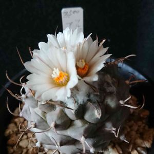 雨でも開いている🌵たち 黄彩玉は雨でも比較的開く花です ③ 緋花玉は頑張って半開きくらい🌵 ④ アルビナータも半開きくらい🌵 ⑤ 紅梅殿は半分も開いてないですね😅