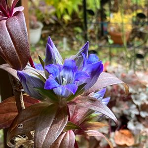 氷点下の朝もやって来た10月下旬。 長く楽しませてくれるリンドウ💜 季節が進み、葉が赤くなってきて 花色との映りも又素敵になりました💖