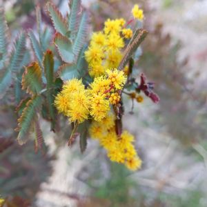 🟡ミモザアカシア🟡 (パープレア) 〜🌿念願の開花🌿〜 2年前、園芸業Oさんからいただきました。 昨春は、蕾を発見したものの何故か開花に出会えずにいました。 今春の庭パトで、ようやく✨️待ち焦がれたミモザ✨️に出会えました〜!