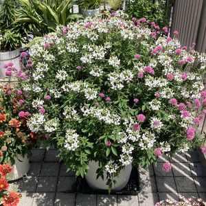 💐 クレオメ セニョリータ ブランカ 💐 PW 🌸ゴンフレナ ラブラブラブ 🌸 PW 1️⃣PWフォトコン" 私史上最高のPW "に応募しました🤗 2️⃣クレオメのドアップ📸 ※PWアンバサダーで届いたクレオメセニョリータ4株とラブラブラブ3株を植えてます。 現在、株幅は約90cm、草丈は約80cm🪴です。 大和プラスチック 底面給水機能付 ウォータープラス 40型プランター🪴とアクアセルキューブを利用して水切れ対策しながら育ててます🧑🏽🌾 しかし、 毎日4リットルのジョウロを2回、合計8リットルの水遣りをしないと夕方には元気が無くなります…😓上杉 ✨笑顔溢れる週末をお過ごし下さい❣️ 👋👋👋