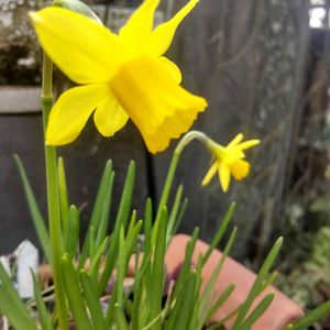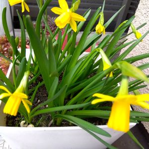 テータテート 丈の短いラッパスイセン 球根を集めて鉢に植えたのが、咲き始めましたね。