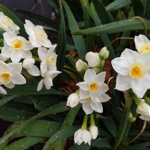 🪴草花たち その131 スイセン「ペーパーホワイト」 副花冠が白いスイセンに出会いました。 純白です。 雨上がりの公園に光が射したようでした。 。.:**:¨°*・..。.:*☆ (´ ︶`*) 🍬さっちゃんさん主催 🏷白い水曜日♡ に初参加させていただきました💕 🌟 *・゜゚・*:.。..。.:*・'🎄'・*:.。. 🎁.。.:*・゜゚・* ⌘ メモ ⌘ 🔸科名・属名 ヒガンバナ科(ユリ科) スイセン属 🔸学名 Narcissus spp. papyraceus Narcissus papyraceus Ker Gawler 🔸英名 Paper White Narcissus 🔸別名 シロバナスイセン(白花水仙) フユザキスンセン(冬咲水仙) 🔸由来 花が紙のような白さをしていることに因む。 🔸原産地 地中海沿岸地方 🔸花期 12月~1月頃 🔸特徴 球根植物。多年草。 ペーパーホワイト(Paper White)は日本水仙 (ニホンズイセン)と同じ「房咲き水仙」の仲間 である。 平安時代に地中海沿岸から薬用としてシルクロー ドを通り、中国を経由して渡来した。 ニホンスイセンは副花冠が黄色だが、この種は 雄蕊を除いて中心部も白く全体的に純白。 根際から生える葉は平たい線形で、葉身は15cm~ 50cm程で、束になって生える(束生)。 花茎を伸ばし、茎先に総状花序(柄のある花が 花茎に均等につく)をつける。花茎3cmほどで 芳香がある。12月頃から開花し、スイセンの仲間 では一番早くから開花する。 花の後にできる実はさく果(熟すると下部が裂け、 種子が散布される果実)である。