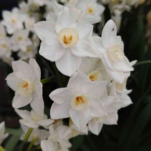 🪴草花たち その123 ニホンスイセン(日本水仙) 日本水仙が綺麗でした。 📍 「吹雪く中 水仙なほも 花かかぐ 」 山口青邨 📍 「月落ちたり 水仙白き 庭の隅 」 正岡子規 📍 「初雪や 水仙の葉の たわむまで」 松尾芭蕉 📍 「家ありて そして水仙畠かな」 小林一茶 📍 「水仙に 狐あそぶや 宵月夜」 与謝蕪村 🌟 *・゜゚・*:.。..。.:*・'🎄✨・*:.。. 🎁.。.:*・゜゚・* ⌘ メモ ⌘ 🔸科名・属名 ヒガンバナ科 スイセン属(ナルキッスス属) 🔸学名 Narcissus tazetta var. chinensis 🔸英名 Japanese daffodils 🔸別名 金盞銀台(キンサンギンダイ) 🔸由来 ❇︎中国の古典にある「仙人は、天にあるを天仙、 地にあるを地仙、水にあるを水仙」から、綺麗な 花姿と芳香を「仙人」とし、「水仙」。 ❇︎日本には修行僧が持ち帰ったとされ、中国名の 「水仙」をそのまま音読みにして「スイセン(水仙)」 となる。 ❇︎ 「金盞銀台」 蓋し金盞は副冠であり、銀台は花冠で、その花 の形の形容。 🔸原産地 イベリア半島を中心とした地中海沿岸地域 🔸分布 国内では、本州の関東地方以西、四国、九州の 海岸に野生化 🔸花期 11月中旬~4月 🔸花色 白 🔸特徴 球根植物。多年草。 日本へは中国から平安時代末期頃に渡来したと 言われ、野生化していることから、ニホンズイ セン(日本水仙)の名前で呼ばれ、伊豆、紀州、 越前岬などに群落を作って咲いている地域がある。 丈は30~50cm。葉は20~40cmの細長 い線形で平たく白い粉をふいたようになる。その 葉の間から花茎が伸び、数個の花を横向きに咲か せる。花の直径は2.5~4cmほど。花弁のよう に見える部分は「花被片」で、6個に分かれて いるように見えるが、もとの部分では合着して いて筒状になっている。その咽喉の部分に黄色で 杯形のカップがついていて、これを「副花冠」 という。雄蕊が6本、雌蕊は1本。 暖かい地方なら年内に開花するのは珍しくはなく、 開花時期は半年ほどとなり、かなり長い。 🔸品種 花形による分類 ⑴ラッパ ⑵大杯 ⑶小杯 ⑷八重咲き ⑸トライアンドラス系 ⑹シクラミネウス系 ⑺ジョンキル系 ⑻タゼッタ系 ⑼ポエティクス系 ⑽野生種 (11)スプリットコロナ …など。 ニホンスイセン(日本水仙)は、このうちタゼッタ 系に入る。