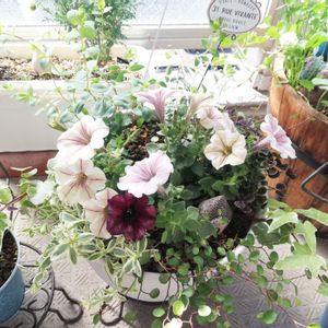 寄せ植えを作りました。 昨年は何も知らずにペチュニアたちをバルコニーからの雨が滴る場所に地植えしてしまいました… 今回はもう少し守れる場所へ。大切にします。