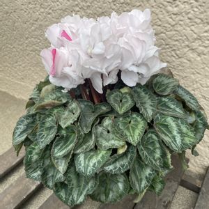 3年目のガーデンシクラメンの白うさぎ❓さん あまり綺麗じゃないけど咲いてくれました。