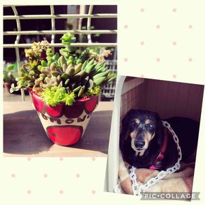 たかこさんから頂いた白絹姫と紅稚児とアロマティカス(о´ェ`о)✨ 実は紅稚児、気になってたので嬉しいです (/ω\*)❤️ ワンコちゃんの表札を手作りして付けてみました(*´艸`) 今日はシャンプーに連れて行き、ワンコちゃんも気持ち良さそうにしてました(*´`) そこのお店に子宝草(だったかな?)いっぱいあって1鉢頂いちゃいました😅 雨を考慮して旦那さんが屋根を手作り✨ その腕を活かして多肉棚作って欲しい(☆ω☆*)と心の中で思ってます😅 少しずつワンコちゃんが心を開いてくれてきました😊