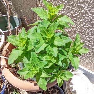 検索したら「ステビア」と出ました。 白色の小さな花が咲くそうですね。 購入した覚えが無いので、鳥が種を運んで来たのかな❓ 自宅のベランダにて。 2022年5月3日撮影