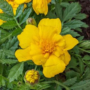 黄色のマリーゴールド 駅前バス停留所の花壇。 2022年5月2日撮影