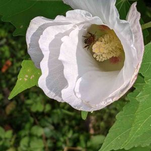 本日のフヨウ (芙蓉) 🐝蜂でしょうか❓ 身体中花粉だらけにして、蜜を求めていました。 敷地内にて 2021年9月28日撮影