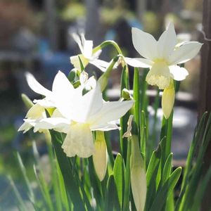 私は白い水仙が大好きで今年もきれいに咲いてくれて嬉しいのですが その品種には無頓着のまま来てしまいました …が皆さんのお写真を拝見するうちもしかしてタリアかしらと思っていた純白の水仙がタリア・ロココという名前だと昨日花友さんから教えて頂けて嬉しかったのです さてイロハモミジの半日陰花壇にもう一つ咲き出した水仙…このタリアと姿が似ています タリアの種類を調べてみると 純白の花びらに爽やかなレモンイエローのカップ…タリア・サンと出て来るものに似ています…どうでしょうか? 因みに水仙タリアの花言葉はAngel’s tears "天使の涙“だそうです 🇺🇦🙏💧
