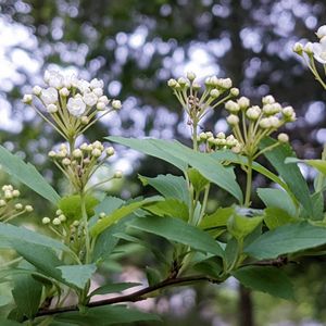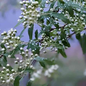 夕方 デッキ前で 雨に濡れた八重咲きコデマリの蕾が膨らんでいました