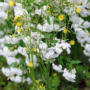 昨日の強い雨で八重咲き小手鞠が随分下までしなだれて その下に生えている黄色いオニタビラコまで届いてしまっていました 白と黄色でちょっといい景色になっていました