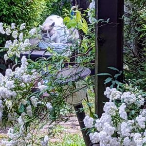 何ヶ月振りかでデッキの外干し… この所の強雨強風で八重咲き小手鞠の姿もすっかり乱れて…花後にはもう少しコンパクトにしてあげた方がいいかもしれません その向こうでは庭パト助手チロの何回目かの食事…我が家の日常風景です 🇺🇦🙏💧