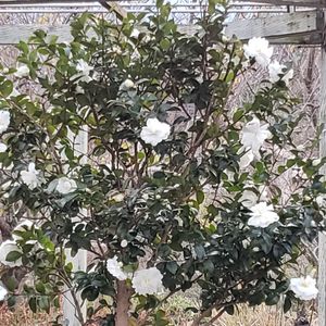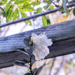 パーゴラの下の白い山茶花も段々咲いています。…アプローチの朝倉とは又違った純白の美しさです。 🏷【額縁シリーズ】