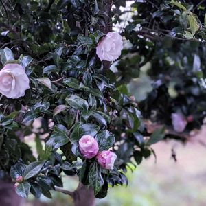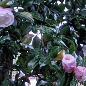 雨の中、アプローチの山茶花…朝倉…がそれらしい花色を見せてくれていました。白地にほんのりピンク。美しい山茶花、これからが楽しみです。 🏷ピンクワールドへようこそ
