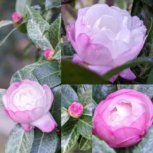 アプローチの山茶花「朝倉」…随分咲き進んで来ました。白地にふんわりピンクで夢見る乙女のようなお花です。 🏷ピンクワールドへようこそ