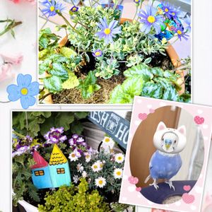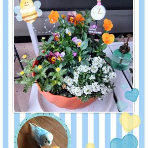 4月15日🐦🌿🐦 インコの日参加します🐦🌿🐦 セキセイインコのクッカ🐦 にゃんこバージョン😽 上の鉢植え🪴 ブルーの💙ブルーデージー 欲しかったお花です💞 バーベナと花かんざしの寄植えは玄関先に🪴 かまぼこの板で作ったお家のピックが映えます🏠