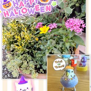 10月15日 インコの日🐦参加します🐦 今回はフラワーパークの館内の ハロウィン🎃オブジェとコラージュ 朝が冷えるのでクッカ🐦も暖房付けました😊 昼間はまだ夏日があります💦 気温の差に気をつけて過ごしましょう🍁🎃🌾🍄🟫🌰