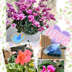 今年最初のインコの日🐦 参加します🐦🌿🌹🌿 セキセイインコのクッカ🐦 私の携帯電話カバーをかじるのが大好き💦💦ボロボロです😅 お花はサンルームの㊥で ずっとお花を咲かせてるシクラメン💓ピコ 少しオレンジがかったお花と濃いピンクのゼラニウム💕