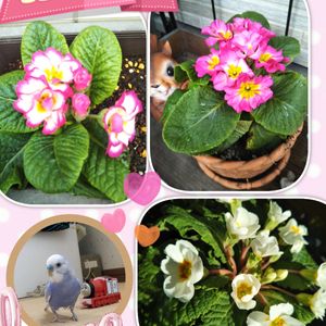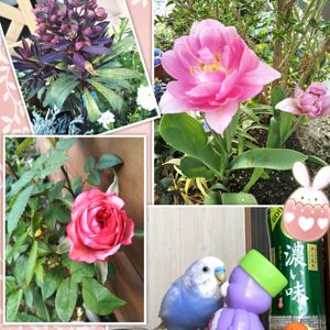 15日 インコの日参加しまーす🐦 クッカ🐦はお気に入りのくまさんと遊んでます🐦🎶🎶 お花はお庭のユーフォルビア 去年のピンク💗チューリップ 球根が植えてあるのも忘れてました😻 左下はミニ薔薇今年初めての開花です🌹🌿🌹🌿