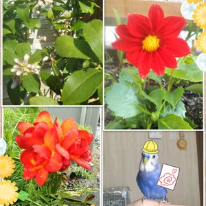 我が家の小さなお庭💐 マイヤーレモンの花がたくさん蕾をつけて咲いてます🌼 上の赤いダリアファイヤーワークス❤️情熱カラー❤️ 左の赤のフリージア 去年花が咲いた後忘れていたお花綺麗に咲いてました❤️ セキセイインコのクッカ🐦 幼稚園になったらこんな感じ?!🤣💦