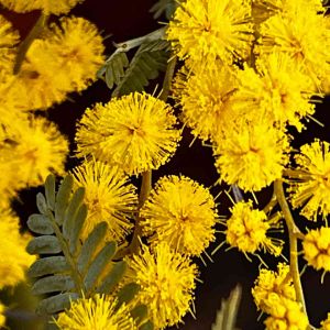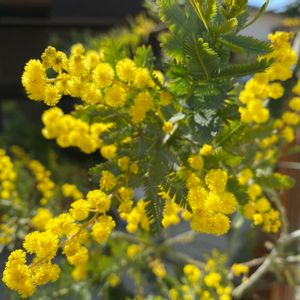 無数の小さな黄色い花を 枝先につけます🟡🟡🟡 花は長く伸びた雄しべから できていますが〰 ごく僅かに小さな花びらと 雌しべが一緒に付いています🎶 葉色が銀白色😻 銀葉アカシア マメ🫘科