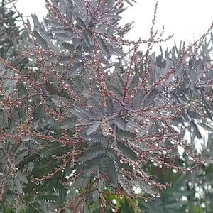 銀葉アカシア・プルプレア (ミモザ) シルバーリーフと、紫の新芽に一目惚れ😵💘して、20年くらい前にお迎えしました。 今日も雨のしずくをたくさんまとって、涼しそう。花芽もたくさん‼️