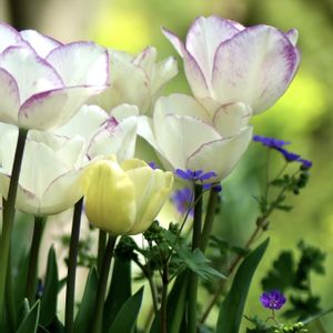 今日のお花 チューリップ 過去picから この子も気に入りでした🤗 シャーリー 咲き始めのクリーム色から白にかわり、紫の縁取りが入るオシャレな子♡‧₊˚ チューリップは連作障害があるので、今年は場所もなく、ほんの少し、早咲きのアプリコットビューティを植えました。 春が待ち遠しいです(*˘︶˘*).。.:*♡