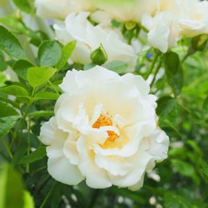 バラ サマースノー 爽やかな雰囲気のあるバラ💓 シベと、花の対比が良い💕 良く咲いてくれる。そして、良く茂る。枝を間引いて、夏の葉ダニ対策。 (๑•̀ㅂ•́)و✧するぞ!