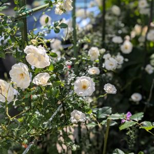 今日のバラ🌹 【1枚目】ベストショットはグラハムトーマス。青空に映えます😍👍 【2枚目】オールドローズのルイーズオディエは今年は色鮮やかです😍 お花も大きめです。オールドローズなので香りが最高ー!😆💕 【3枚目】ルイーズオディエは我が家の第1号のバラかつ一番の古株で、まだ枯れることなくこんなに蕾を付けてくれました。昨年開花時は葉っぱがスカスカでしたが今年はワサワサ茂って元気そうで、まだまだ若い者には負けないぜ! という意気込みを感じます🤭 【4枚目】いつも貧弱な枝ぶりで、毎年今年で最後かも……と思わせるレイニーブルーですが、今季は少し元気そうかも? 葉っぱが活き活きして見えます。蕾はどうでしょう? 少ないかな? まぁ毎年こんな感じですね😅 貧弱なのでベルサルシュートなど出たこともありませんが、古枝のままで毎年なんとか咲いてくれています。いつか元気なシュートを見たいなぁ😢 【5枚目】玄関横が定位置のつるサマースノー。今年は少し厚みが増す誘引にしたようです。(母が) これ鉢植えなんですよー😁 鉢植えでこんなに元気に育つバラは(うちでは)珍しいかも。すごく丈夫なんだと思います👍 明日は一日中雨の予報です。どうせならしっかり降って潤って欲しいなぁ😚