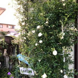 頂きものの つるバラサマースノー 花を見たのは初めて! 初めに植えた場所が悪く あまり成長せず 午前中からしっかりと日が当たる場所 ここへ移したらグングン聖地!!
